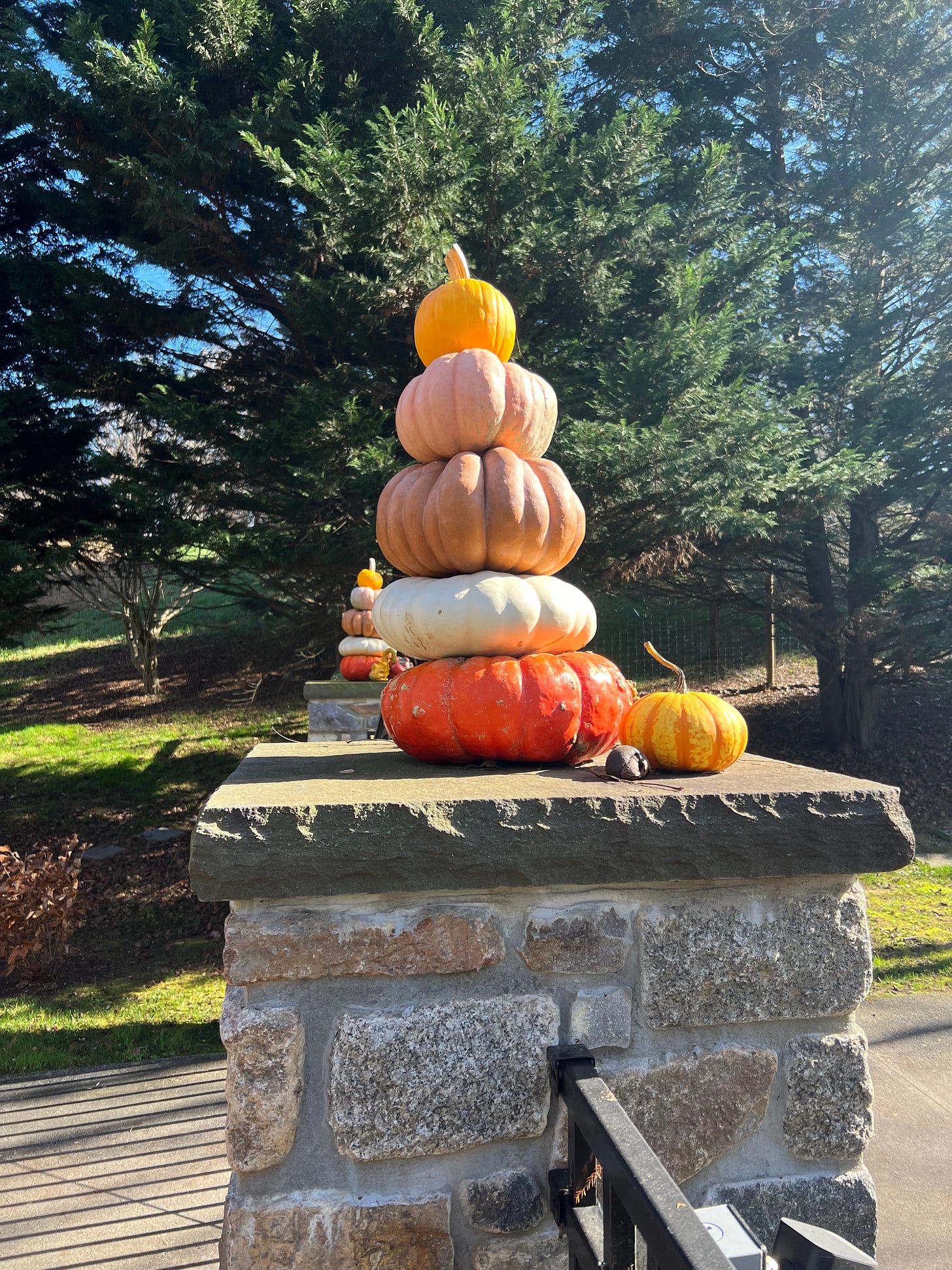 As our house is not visible from the road, we don’t put on a big pumpkin and gourd show, but the women who refresh our planters every season (shout-out to Prairie Wind) compose seasonal displays atop our gate pillars. I referred to these above as “sorry remains,” but in fact they have weathered well so far, I suspect because we have yet to experience a hard frost. Here’s what they look like today (black walnut fruit added by nature):